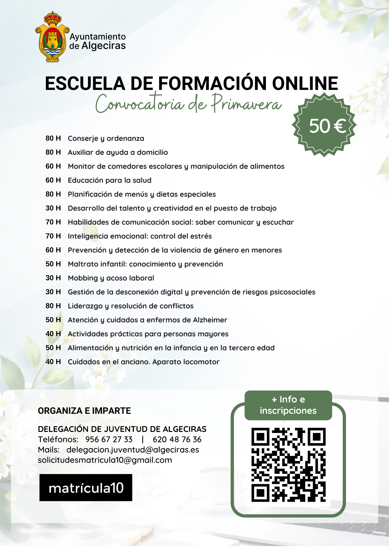 Vuelve la Escuela de Formación Online del Ayuntamiento de Algeciras y Matrícula10. Esta escuela online ofrece una amplia variedad de cursos pertenecientes a distintas familias profesionales, diseñada para mejorar la empleabilidad de los jóvenes y facilitar su acceso al mercado laboral. Además, muchos de estos cursos puntúan en bolsas de empleo y oposiciones, siempre que así lo indiquen las bases específicas.