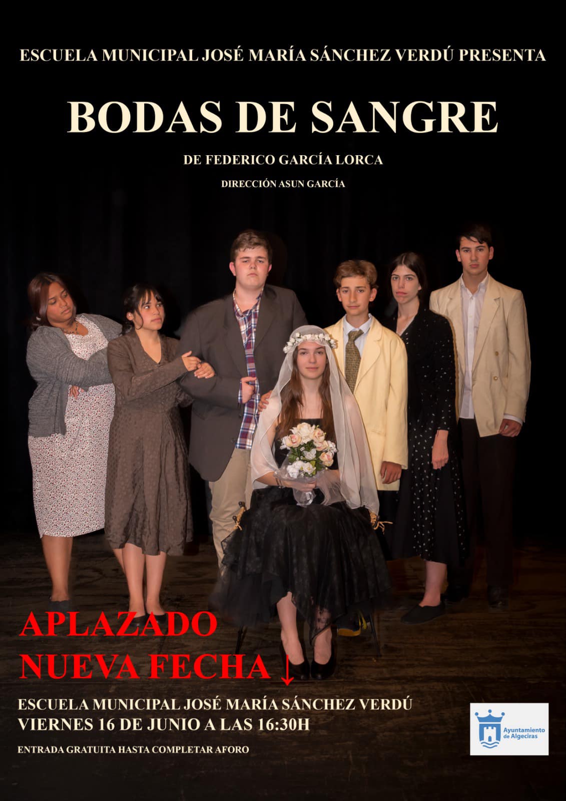 Fri Jun 16 16:30:00 CEST 2023 Fri Jun 16 18:30:00 CEST 2023 Obra de teatro "Bodas de sangre" Muestra de fin de curso del Aula de Teatro de la Escuela de Música, Danza y Teatro "José María Sánchez Verdú". Ficha del Evento Lugar: Escuela de Música, Danza y Teatro "José María Sánchez Verdú". Precio: Entrada libre Inicio: Fri Jun 16 16:30:00 CEST 2023 Fri Jun 16 16:30:00 CEST 2023 Finalización: Fri Jun 16 18:30:00 CEST 2023