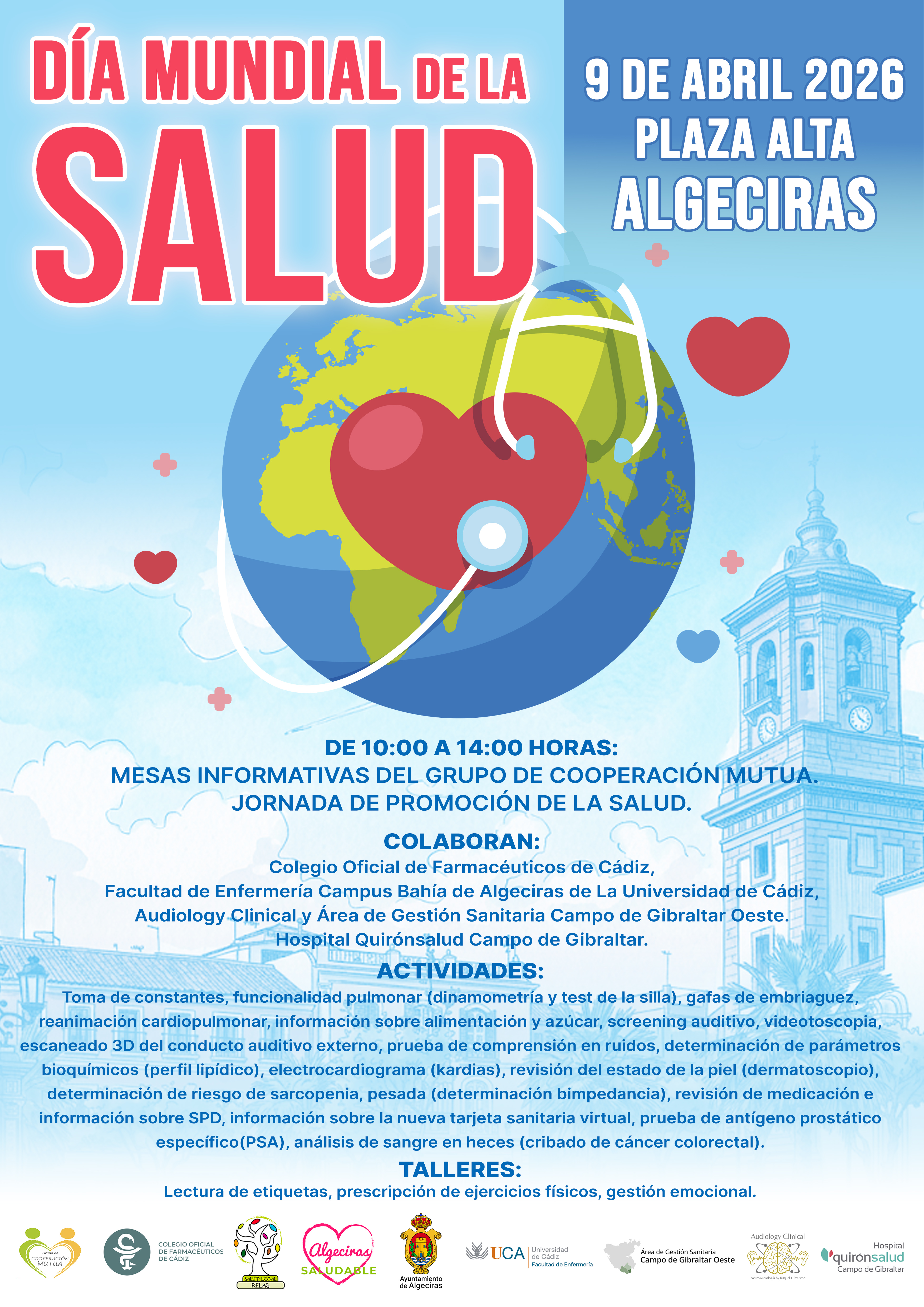 Por su parte, Quiles ha invitado a la ciudadanía a participar en este evento, y además, ha mostrado su agradecimiento al Grupo de Cooperación Mutua y a las asociaciones que la conforman, así como al Colegio Oficial de Farmacéuticos de Cádiz, la Facultad de Enfermería Campus Bahía de Algeciras de la Universidad de Cádiz, Audiology Clinical, el Área de Gestión Sanitaria del Campo de Gibraltar Oeste, y el Hospital Quirón Salud Campo de Gibraltar por su colaboración a la hora de organizar esta programación de actividades por el Día Mundial de la Salud.