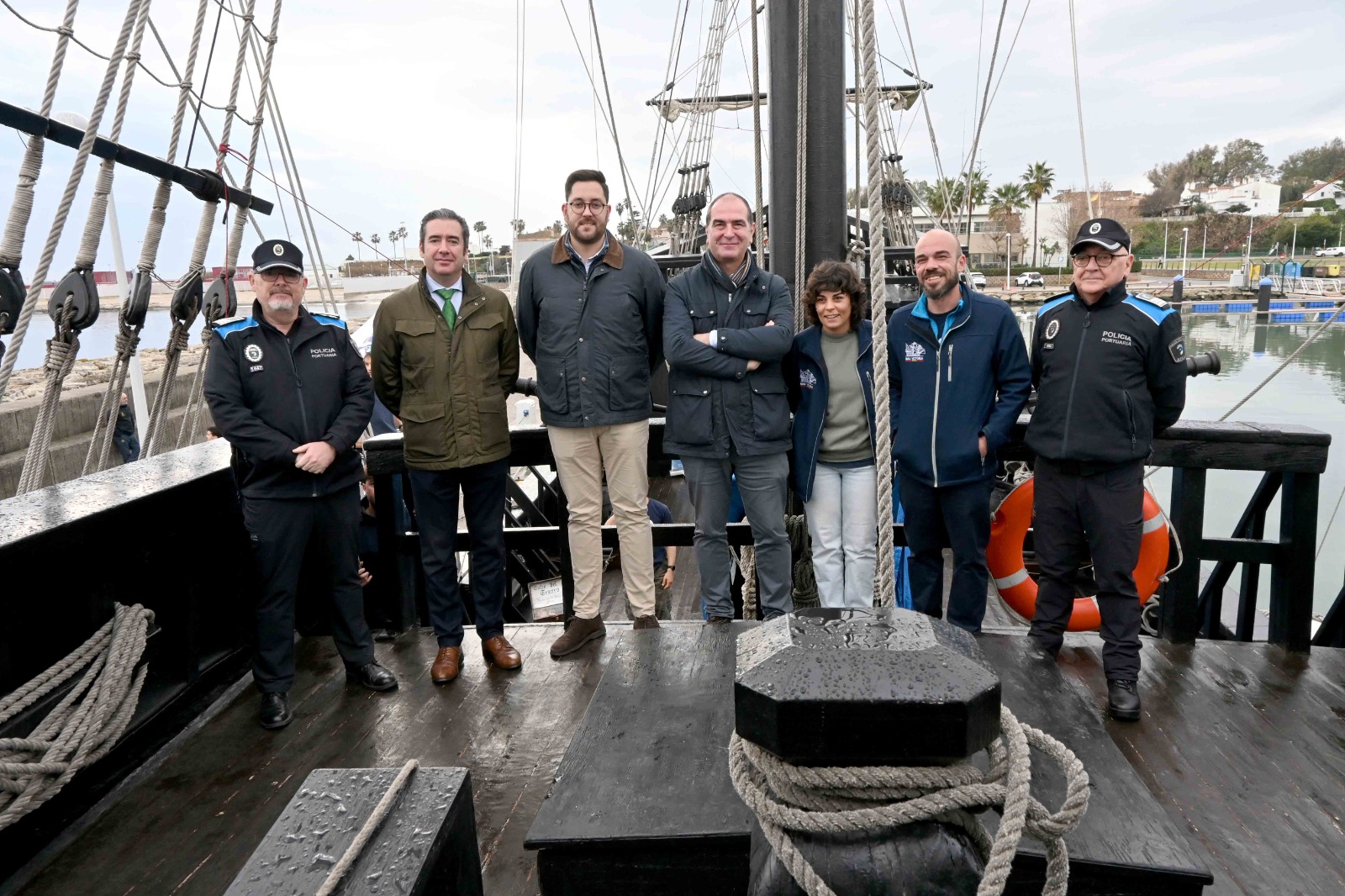 El delegado de Emalgesa, Álvaro Márquez, ha sido el encargado de dar la bienvenida en nombre de la ciudad a la tripulación de la réplica de la Nao Victoria, que desde hoy y hasta el próximo día 25 de enero permanecerá atracada en el Real Club Náutico de Algeciras. Junto a Márquez, y en representación de la Autoridad Portuaria de Algeciras estuvieron los jefes del Área de Desarrollo Sostenible, Juan Antonio Padrón, del Departamento de Autoditoría Interna y Cumplimiento, Davíd Pinto, y e respontable de la Policía Portuaria, Cristóbal Vadillo.