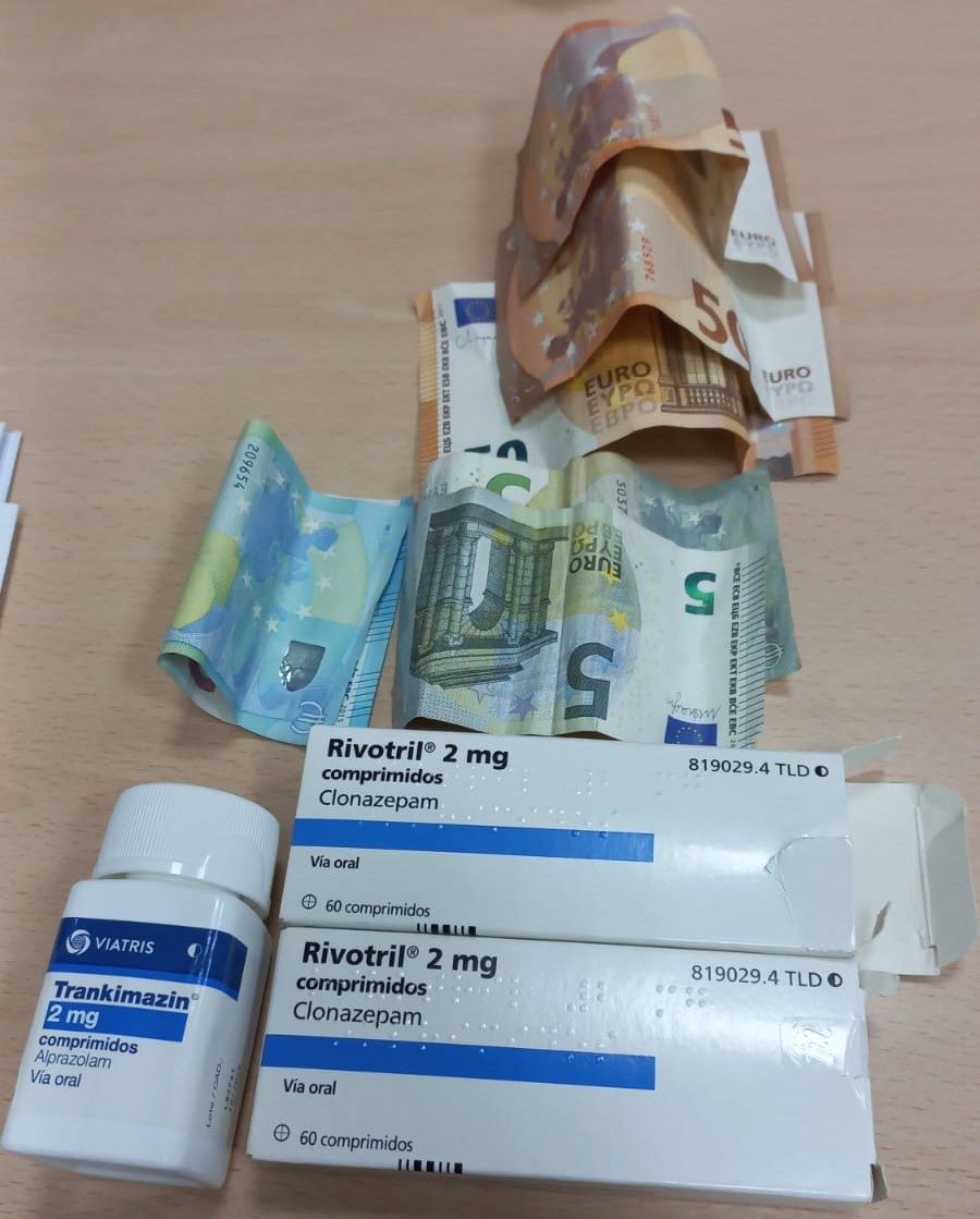 Al hombre le fueron encontradas en un bolsillo de la chaqueta tres pastillas de Tranquimazim, por lo que fue propuesto para sanción administrativa, mientras que dentro del coche y en el asiento del copiloto había dos cajas de Rivotril, por lo que ante las sospechas de que pudiese portar más sustancias fue solicitada la presencia de una agente para realizarle un cacheo, localizando en varias partes de su cuerpo más pastillas y 180 euros en metálico.