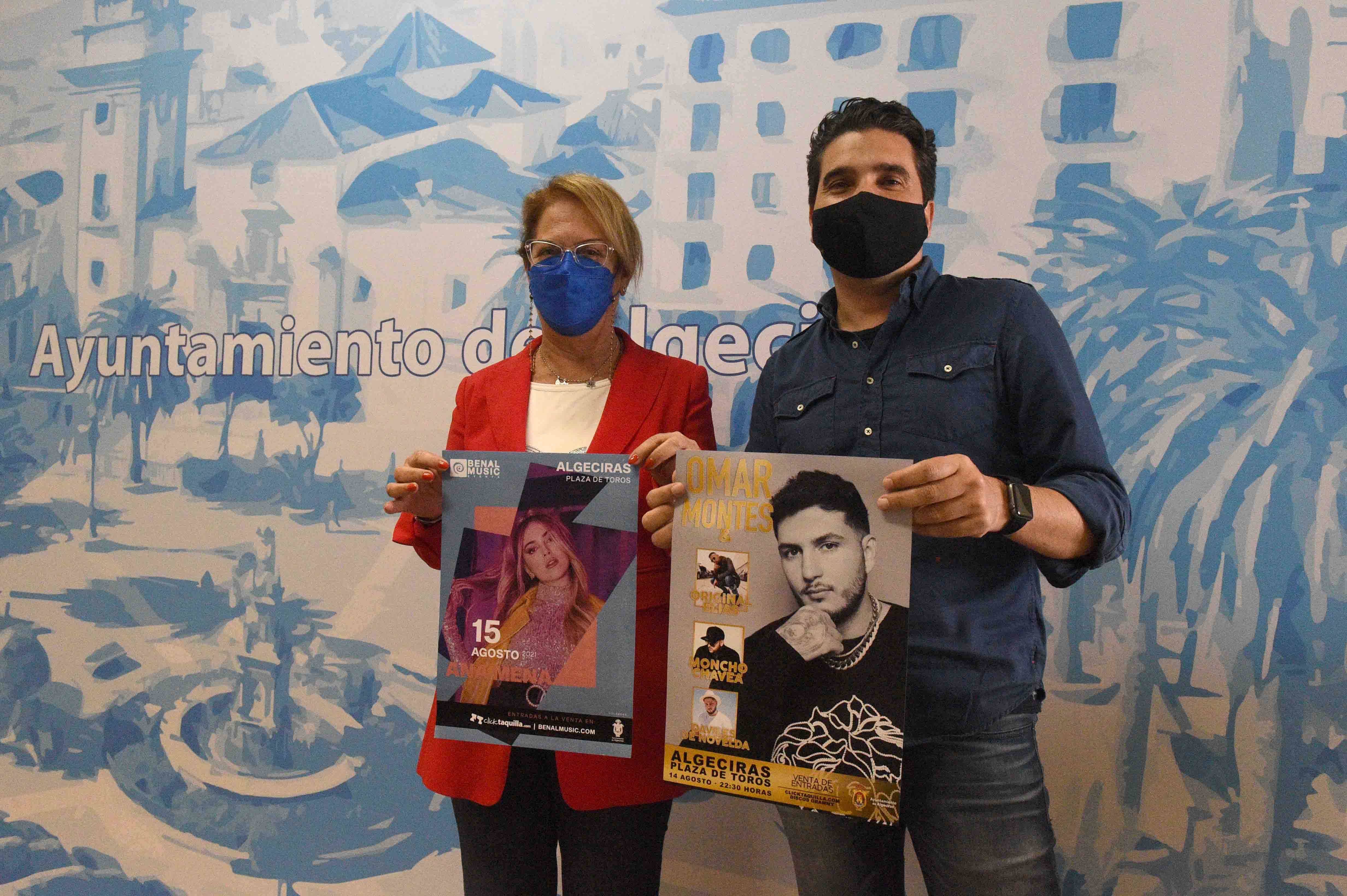 La teniente de alcalde delegada de Feria y Fiestas, Juana Cid, junto a Eduardo Hidalgo, director del evento, han presentado en la mañana de hoy el cartel de la primera edición del Festival de Reggaeton en Algeciras, que se celebrará el sábado 14 y domingo 15 de agosto en la Plaza de Toros “Las Palomas”.