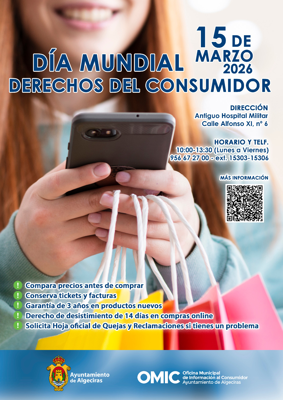 El Ayuntamiento de Algeciras, a través de su concejal delegada de Salud, Consumo, Mercados y Comercio, Sabina Quiles, se ha sumado a la conmemoración del Día Mundial de los Derechos del Consumidor, que se celebra hoy domingo, 15 de marzo, y lo hace poniendo en valor el trabajo que se desarrolla, desde hace ya más de cuatro décadas, en este sentido desde la Oficina Municipal de Información al Consumidor.