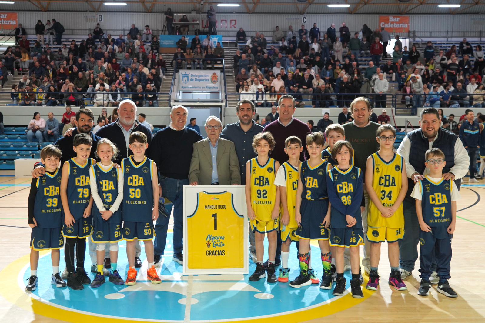 Momentos antes del comienzo del partido, el alcalde participó en el homenaje brindado por el CB Algeciras a Manono Dugo, delegado de campo del club desde 2017, vinculado al club de baloncesto desde el año 2000, cuando ocupó la vicepresidencia hasta el 2007, pasando a continuación a ser su presidente hasta 2012.
