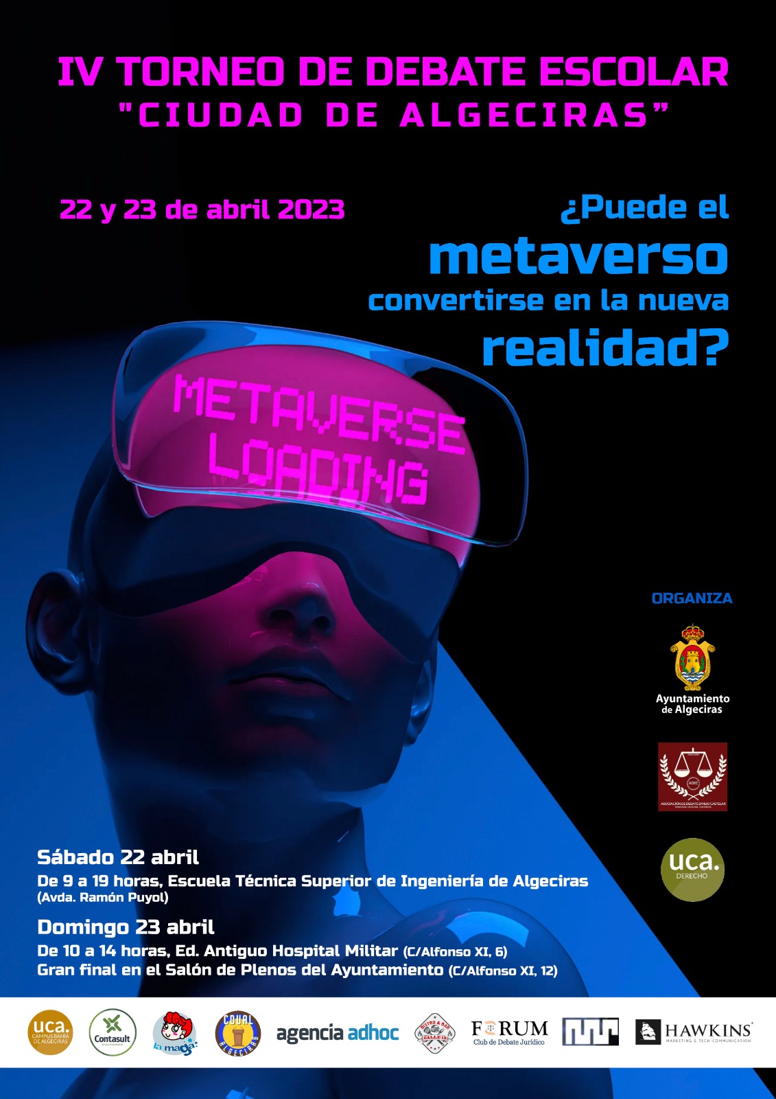 El teniente de alcalde delegado de Universidad, Sergio Pelayo, ha anunciado que este año el tema del debate será ‘¿Puede el Metaverso convertirse en la nueva realidad?’ y que, al igual que en ediciones anteriores, el torneo constará de dos fases: la primera de ellas tendrá lugar el sábado 22 de abril en horario de 9 a 19 horas en la Escuela Técnica Superior de Ingeniería de Algeciras (ETSIA) sita en la Avenida Ramón Puyol. Está será una fase previa de la que saldrán los equipos que se disputarán un puesto en la final que se enfrentarán para tal fin al día siguiente, el domingo 23 a partir de las 10 horas en el edificio municipal del Antiguo Hospital Militar (Calle Alfonso XI). De estos enfrentamientos saldrán los dos equipos finalistas, cuyo debate tendrá lugar en el Salón de Plenos del Ayuntamiento.
