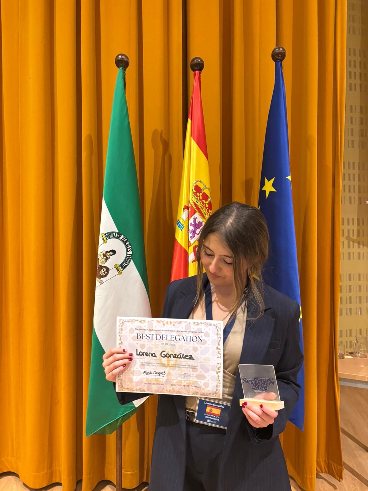 Lorena Gonzalez Rivas, que represento a España en el comité European Council, se alzo con el reconocimiento a la mejor delegacion por segundo año consecutivo "lo que representa un nuevo motivo de satisfacción para la ciudad, que llega otra vez de la mano de una joven estudiante algecireña que se ha convertido ya, por méritos propios, en un referente internacional", subraya el primer edil.