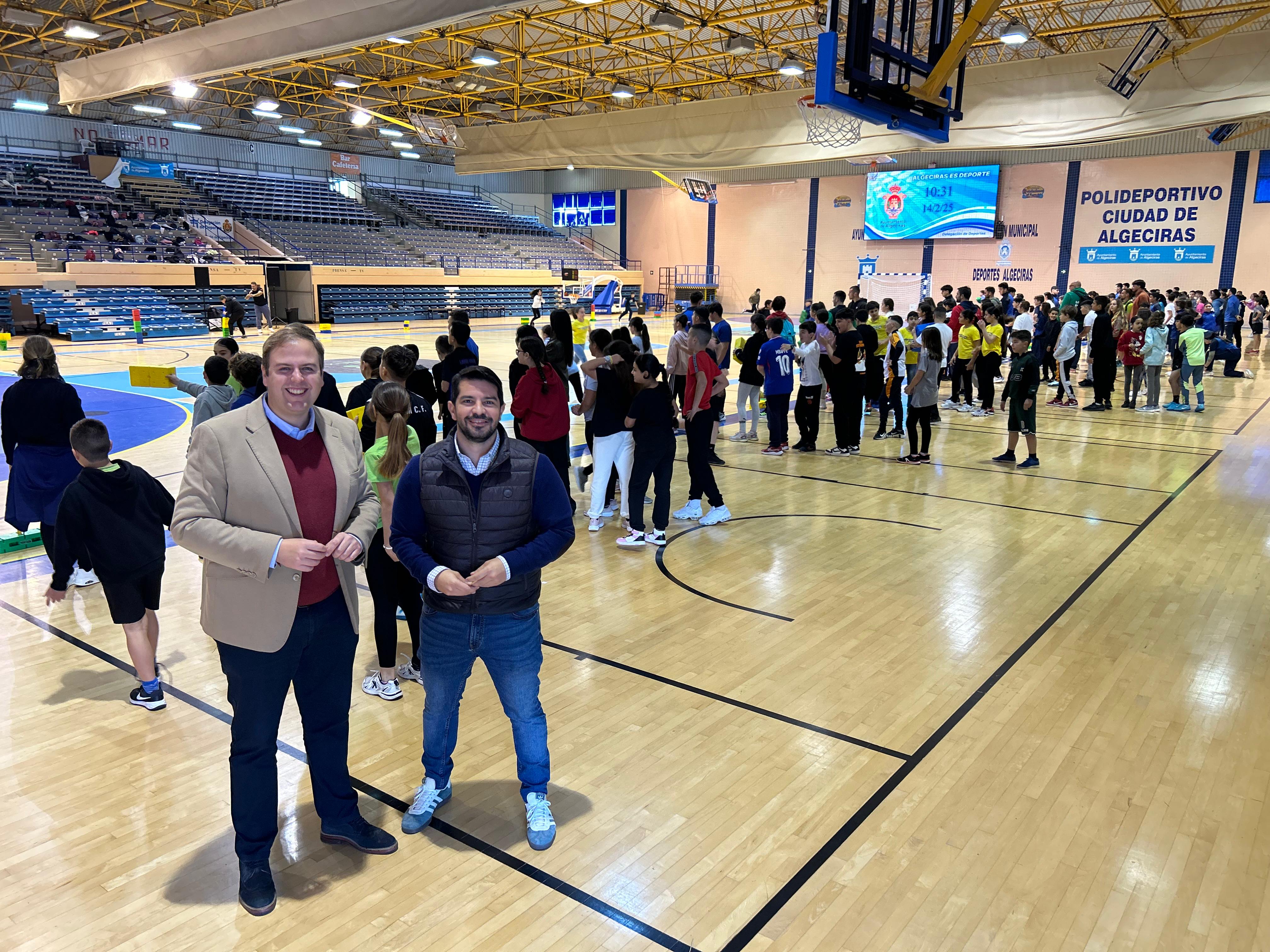 El teniente de alcalde delegado de Deportes, Jorge Juliá, junto al teniente de alcalde delegado de Eduación, Javier Vázquez Hueso, han acudido a las instalaciones del Polideportivo Municipal "Ciudad de Algeciras - Dr. Juan Carlos Mateo”, donde ha tenido lugar en la mañana de hoy la 9 edición del encuentro deportivo ‘Intercentros’.
