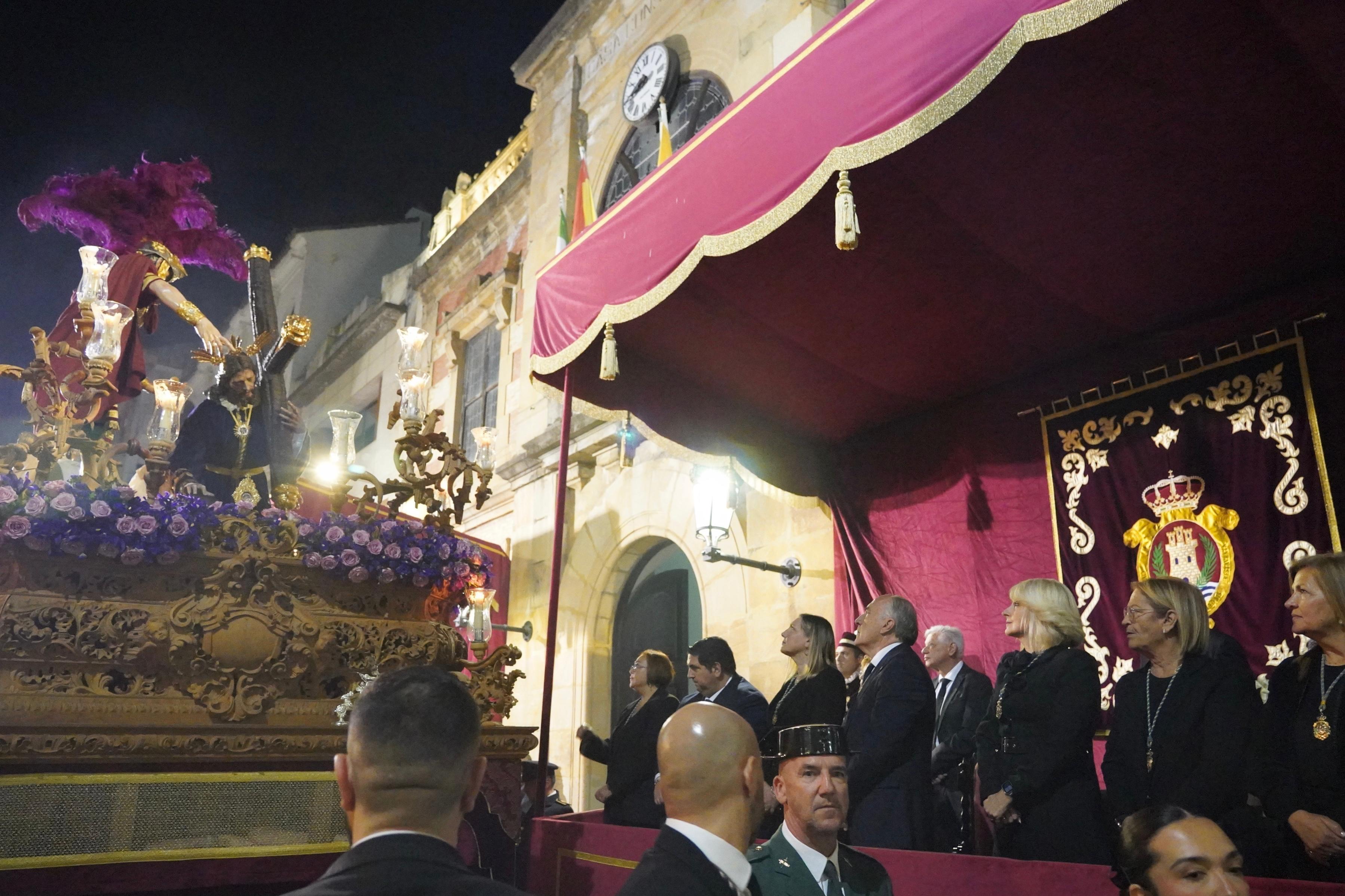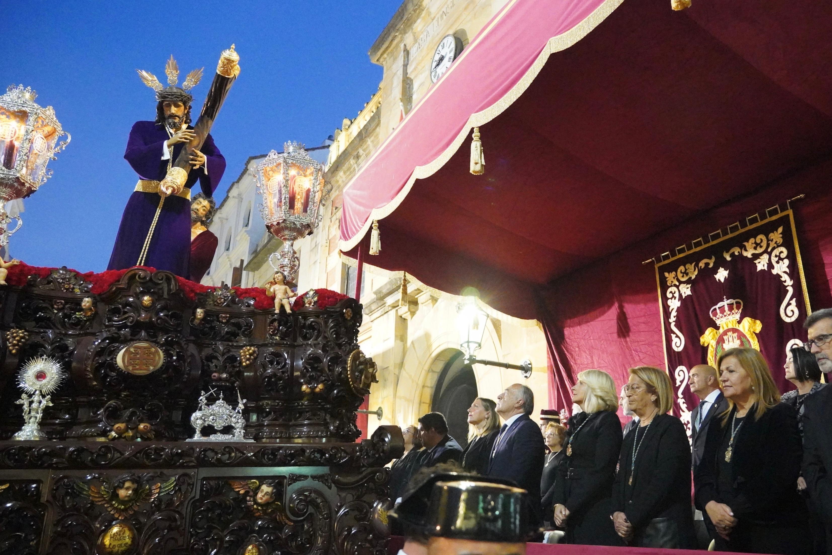 El alcalde, José Ignacio Landaluce, ha presidido la tribuna municipal ubicada en la Carrera Oficial para recibir el primer desfile procesional de este Jueves Santo que ha cumplido con su paso por el Trayecto Común a las puertas del Ayuntamiento de la Calle Alfonso XI. A la imagen del Nazareno, perteneciente a la Venerable y Fervorosa Hermandad de Penitencia y Cofradía de Nazarenos de Nuestro Padre Jesús Nazareno, Santo Cristo de la Fe, Santa Cruz de Jerusalén y María Santísima de la Amargura. El Paso de Misterio estuvo acompañado por la Asociación Musical Rosario de Crevillent, mientras que la imagen de María Santísima de la Amargura lo hizo con la música de la Banda Sinfónica “Amando Herrero”.