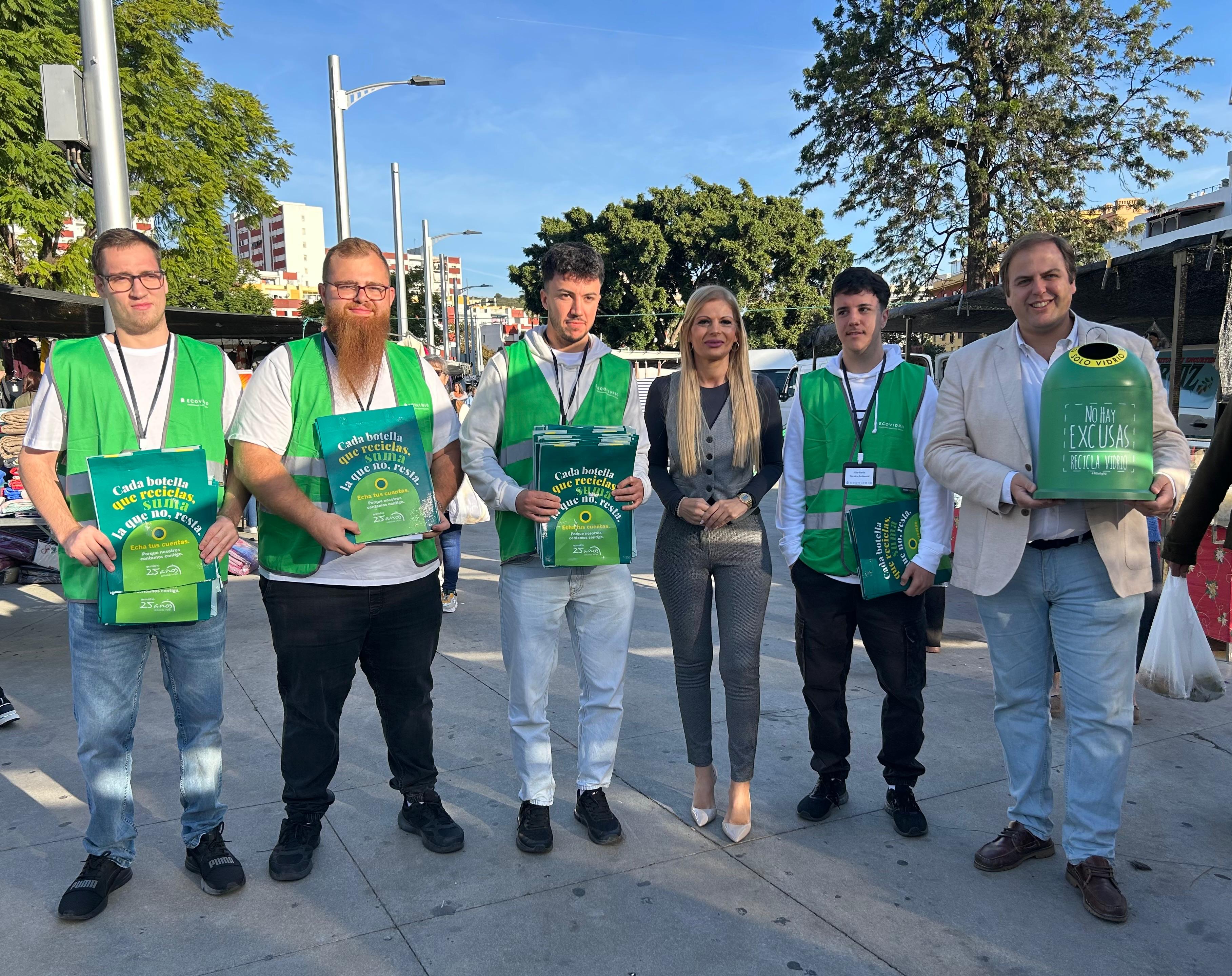 El teniente de alcalde delegado de Medio Ambiente, Javier Vázquez Hueso, junto a la concejal delegada de Mercados, Sabina Quiles, ha visitado esta mañana el mercadillo semanal con motivo del inicio de una campaña de concienciación sobre el correcto reciclaje de los envases de vidrio, puesta en marcha por Arcgisa, el Ayuntamiento de Algeciras y Ecovidrio.