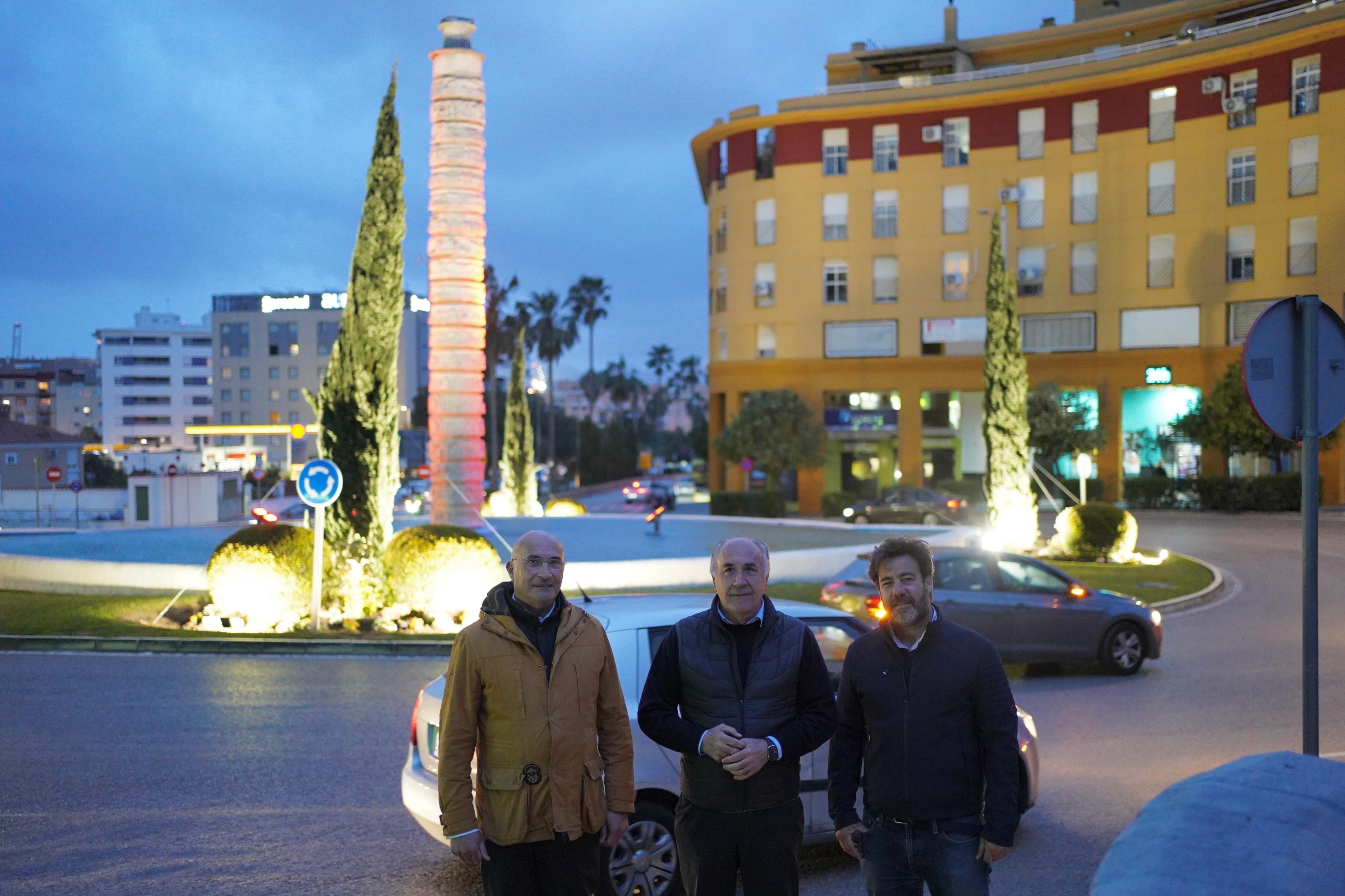 El alcalde, José Ignacio Landaluce, acompañado por el delegado de Parques y Jardines, Ángel Martínez, ha asistido a la puesta en marcha de la nueva iluminación de la ornamentación de la Rotonda del Milenio, enmardanda dentro del plan de mejora de varias rotondas distribuidas por la ciudad.